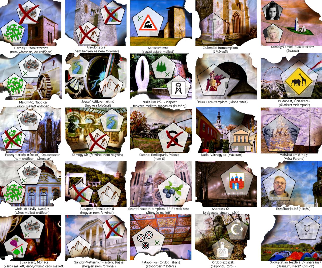 H. Gábor: A "nagy képeket" valamilyen szisztéma szerint össze kellett párosítani pl. romtemplomok, erzsébetek, ördögök, stb. Az így kapott 5db csoportot pedig a "kis képek" alapján kellett megfejteni asszociációval, ez adta a végső helyeket. :)